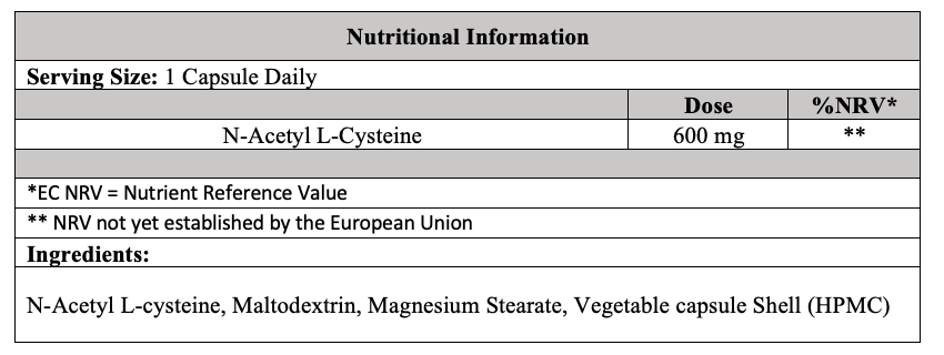 N-Acetyl Cysteine: A sulphur-containing amino acid derivative that replenishes intracellular glutathione, supports detoxification, reduces oxidative stress, and promotes healthy respiratory function.